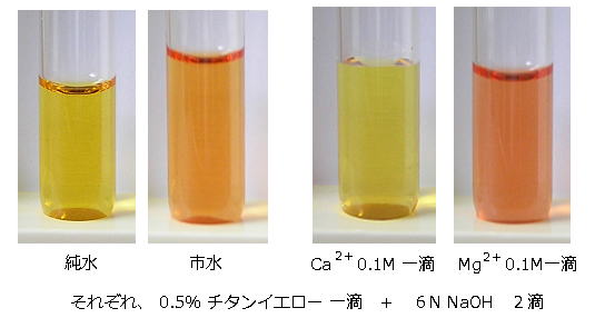 (追記 10/17) Mg2+分析試薬の チタンイエローの 0.1〜0.5%水溶液 一滴 + 6N NaOH 2滴を、ほぼ中性溶液の試料液2〜4mlに加えると、数ppm以上で レーキ沈殿ができ、赤色を発色する。 市水は、約20ppm Mg2+を含む。 黄色(過剰のチタンイエローの色)と赤色(Mgレーキ沈殿の色)が混在する場合、λ=520nm(緑色)程度の