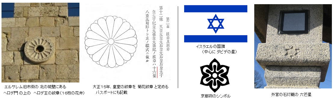 ● 外宮の石灯籠には、ヘロデのマーク(エルサレム城壁のヘロデ門、丸に16枚の放射状の花弁、エドム人が信奉 = 菊花の紋)と ダビデの星(六芒星、ユダヤ人が支持)の両方が刻まれています。