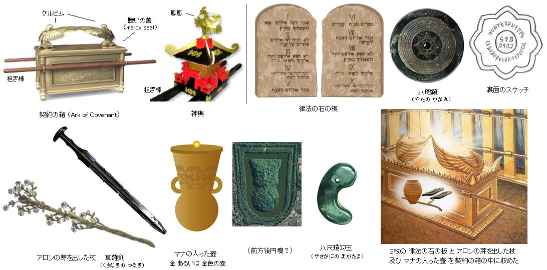 ・ モーセがシナイ山で主から受け取った、律法の書かれている2枚の石の板(何語で書かれたか不明) ・・・・ 八咫鏡(やたのかがみ) としてレプリカとした。