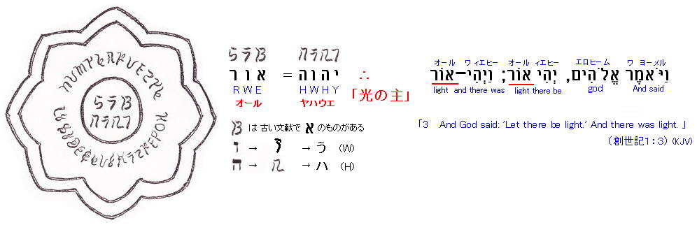 円内の文字列は、森 有礼氏が言うような「エヘイェ・アシェル・エヘイェ」(出エジプト3:14)でも、他の研究者による”ヒフ文字”(存在が疑わしい)でもなく、BC1世紀ごろのアラム語系ヘブライ文字が変形したもので、「光の主(オール・ヤハウェ)」とする 久保有政氏の説が正しいと思われます。(Bに似た文字は古い文献で、=アレフの物が存在するそうです。) これは、すなわち、=”天照大神”