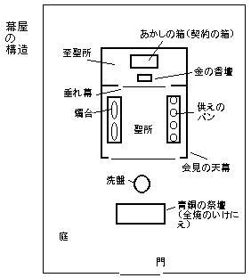 ・ あかしの箱(契約の箱)と贖いの蓋・中にはさとし(律法の書かれた二枚の石の板(神のことば)、アロンの芽を出した杖(復活、いのち)、マナの入った壷(日ごとの食物))