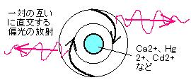 励起した2価の金属元素(Ca、Hgなど)から放射される光は、同時に放射される一対の互いに直交した偏光である。