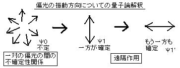 そして、この一方の偏光の振動方向が測定によって確定したならば、もう一方のそれもたといどんなに距離が離れていても直交したものとして確定する(遠隔作用)はずなのである。