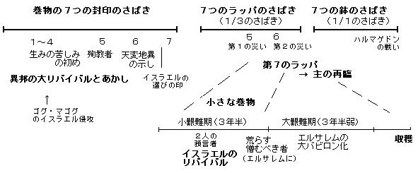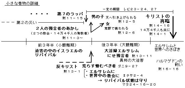 黙示録を基準とする終末の出来事の時間的順序は、基本的に7つの封印の(大きな)巻物により展開されると考えられる。 その間に、艱難期のイスラエルと異邦について書かれてある小さい巻物の最後の刈り取りの時(=主の再臨の時(黙14−14〜16)が、7つ目のラッパが吹き鳴らされる時にほぼ一致するように展開されていく、(また、ラッパのさばきの第2の災い = 2人の預言者のあかし)と解釈してみたい。(マタ24−31、Tテサ4−16、レビ23−24、27)