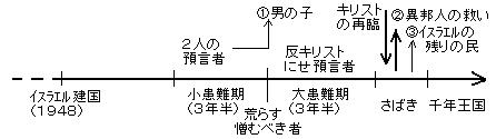 小患難期のイスラエルにあって、生みの苦しみとほとんど同時に、主の教会から真のイスラエルなる2グループの預言者たちが出て、3年半の間世界中であかしをし、反キリストと戦って殉教するが、世界中の見ている中で復活し天に上る。